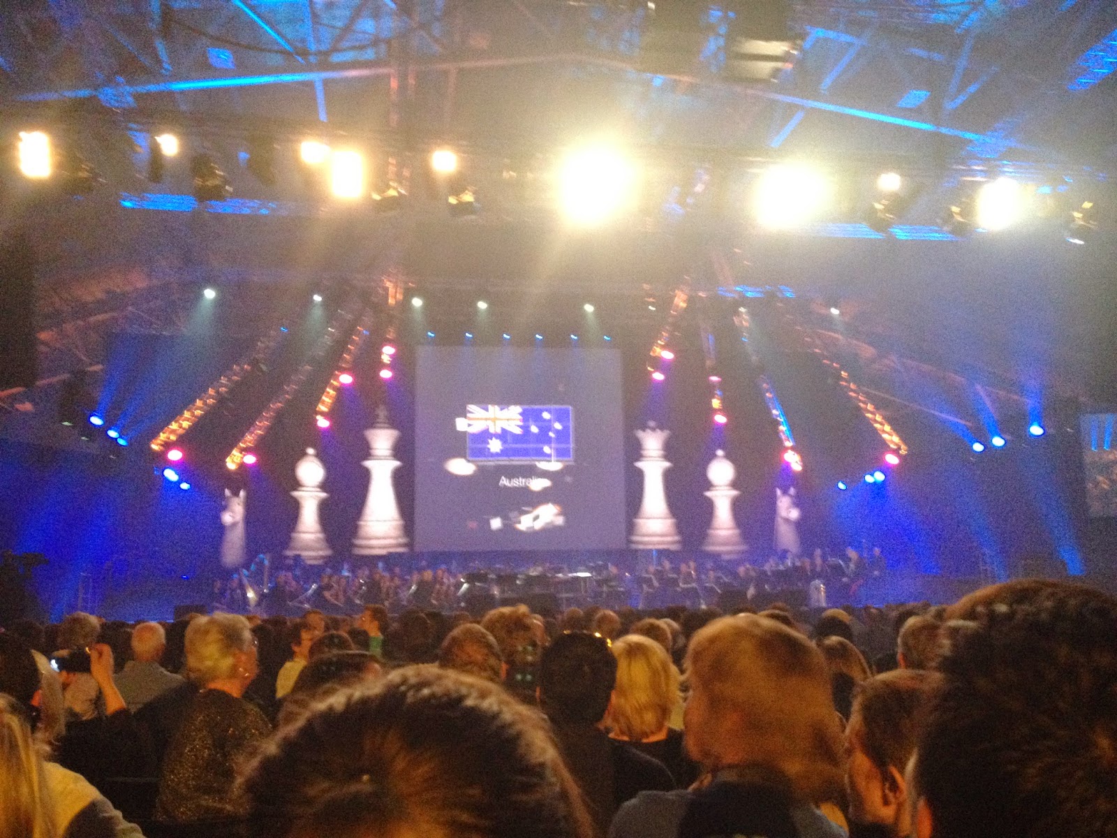 Anyway, we eventually arrived at Tromso & headed to the Edge for an early dinner (scheduled early because of the opening ceremony later that night). Of course I had not taken notice of the time of the ceremony, only that buses would start leaving at 5:15pm. After meeting a few more familiar faces at dinner, I quickly headed to the bus stop & was soon whisked away to another part of Tromso, the Skarphallen, for the Opening Ceremony. Given that it was not due to start until 7:30pm, I found myself one one of the first there, so found a seat, took a few photos & returned to the book that I had been reading earlier in the day. As the crowd filled, I spotted fellow Aussies Manuel Weeks (Open team captain) & Giang Nguyen (Womens board 2) looking for a seat & got their attention (I had a few spare seats near me), so we had a quick catch-up on recent events in out lives before the ceremony began. Below are a few photos that I took: